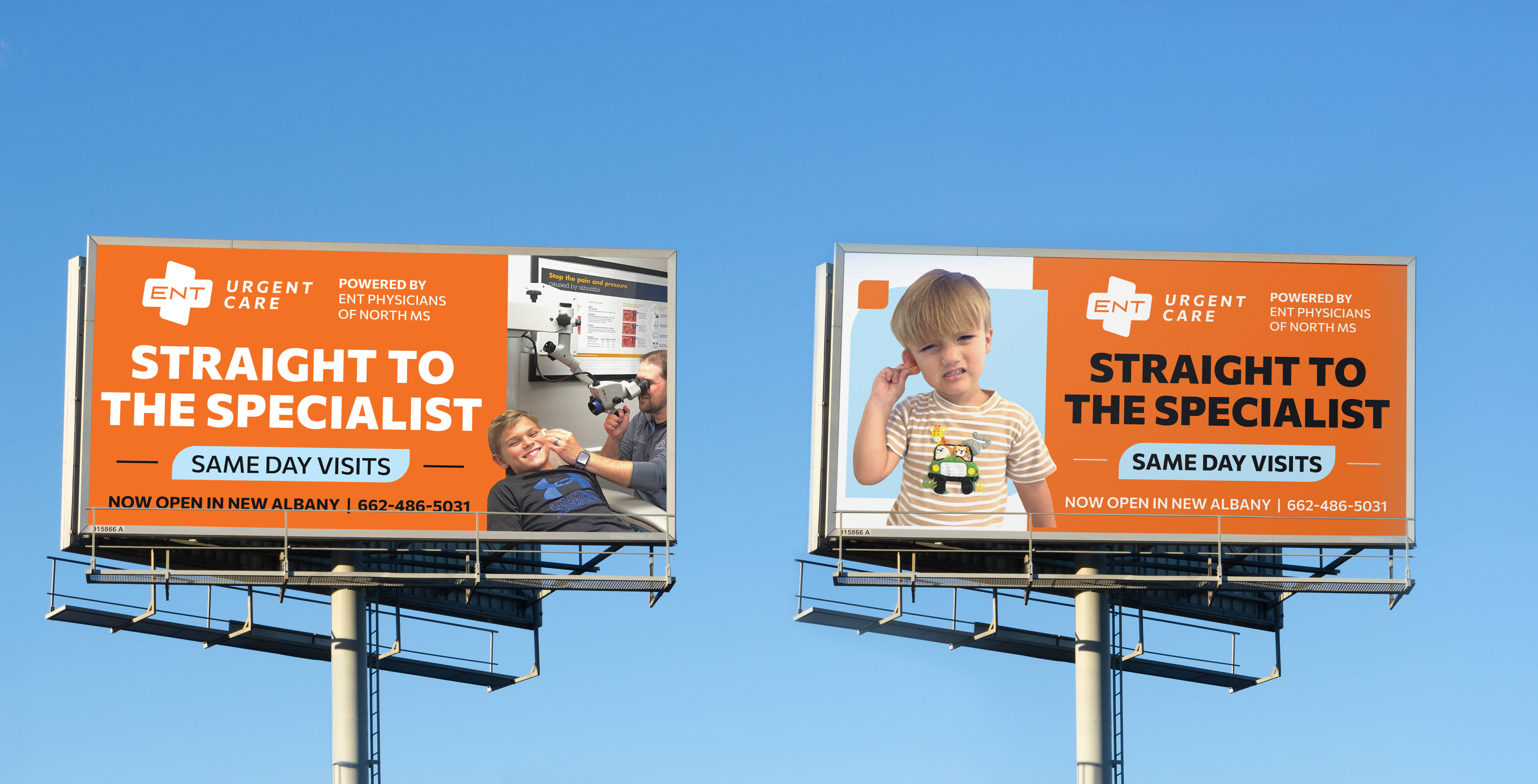 ENT Physicians of North Mississippi had recently opened two new clinic locations and needed to quickly inform the surrounding communities. To maximize visibility, we developed a targeted campaign that combined billboard placements in both cities with direct mail pieces delivered to local households.